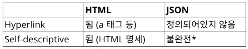 Self-descriptive 측면에서 봤을 때 JSON은 불완전합니다. 불완전하다는 것은 문법은 정의되어 있지만, 안에 들어가 있는 값(key-value)에 대한 정의는 되어 있지 않습니다. 즉, 문법 해석은 가능하지만 의미를 해석하기 위해서는 별도의 API 문서가 필요합니다.