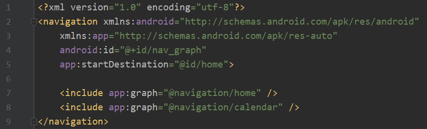 각각의 탭에 대하여 모두 navigation resource 파일을 생성해줘도 되고 nav_graph 파일 내에 fragment 키워드로 각자 선언해도 됩니다. 아래에서는 include 키워드를 이용하여 navigation resouce 파일을 합쳐서 사용하는 방법으로 구현하였습니다.