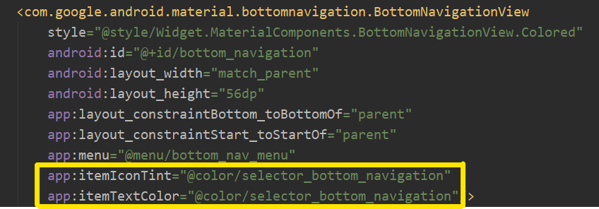 selector를 이용한 xml 파일을 생성한 후에 이를 BottomNavigationView의 속성( itemIconTint, itemTextColor )에 연결해주면 됩니다.