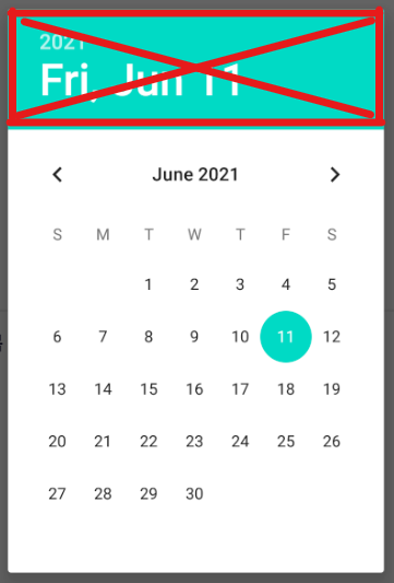 DatePicker를 그냥 사용하면 아래와 같은 화면을 만나게 됩니다. 저는 여기서 위에 민트색 헤더 부분을 없애서 사용하고 싶었습니다.