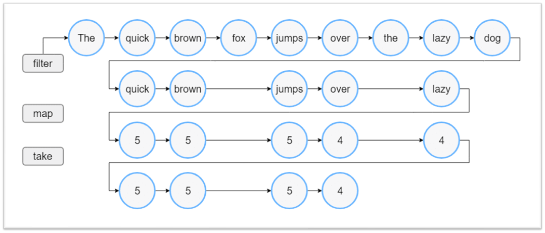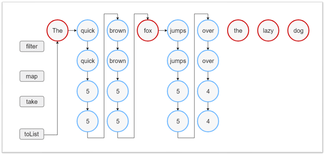 take(4)는 4개의 아이템만 가져오면 되기 때문에, 이를 충족하면 이후 아이템에 대해서는 filter()를 수행할 필요가 없습니다. 이러한 부분 때문에, Collections 보다 연산이 빨리 끝날 수 있습니다.