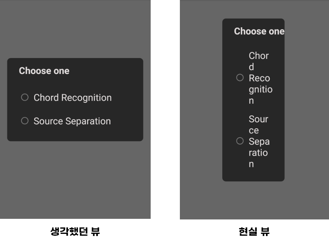 DialogFragment를 띄울 때 내가 설정한 값과 상관없이 Dialog 내용물에 따라 자동으로 뷰가 랜더링됩니다. 분명 android:layout_width="match_parent"로 선언했기 때문에 꽉 차게 랜더링될 것 같지만, 결과물을 보는 순간 내 바램이었다는 것을 깨닫게 되었습니다.